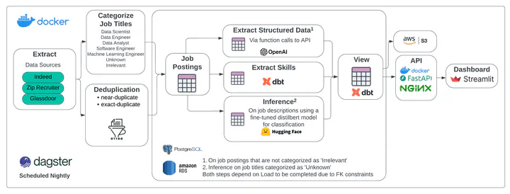 A dashboard served by a pipeline orchestrated using Dagster to extract job postings from various job boards, deduplicate them, load into a PostgreSQL database, and transform via dbt and OpenAI each night. Additionally, a containerized FastAPI service behind NGINX provides secure RESTful endpoints exposing the pipeline outputs.